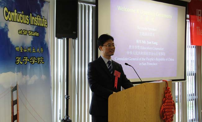 会议由旧金山州大孔院院长谢家新教授主持,代表组委会欢迎来自全美及其他国家的演讲专家及全体参会代表,强调会议宗旨和研讨专题,期望开好这一孔子学院主办的高端汉语教学研讨会,共同探索汉语教学的发展与未来。旧金山州大校长Leslie Wong、中国驻旧金山总领馆教育组杨军参赞出席开幕式并致辞。校长Leslie Wong在致辞中高度赞扬孔子学院成立十年来在推广汉语教学、为学校和社区提供各种资源、培养未来世界所需人才方面做出可喜贡献。校长还跟与会代表分享他个人的成长经历及在北京访问期间的点滴来阐明当今世纪第二语言学习的重要。杨军参赞祝贺大会召开,感谢出席会议的专家学者及广大教师在汉语推广方面所做的努力与贡献,并勉励大家在以后的教学工作中加强研究,为汉语在美国乃至世界的推广多做贡献。