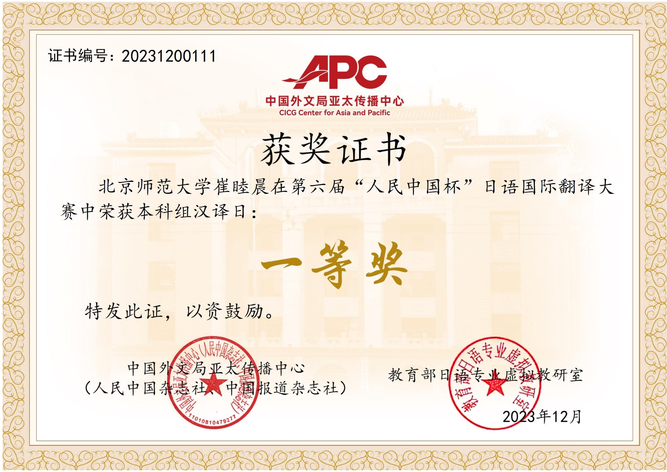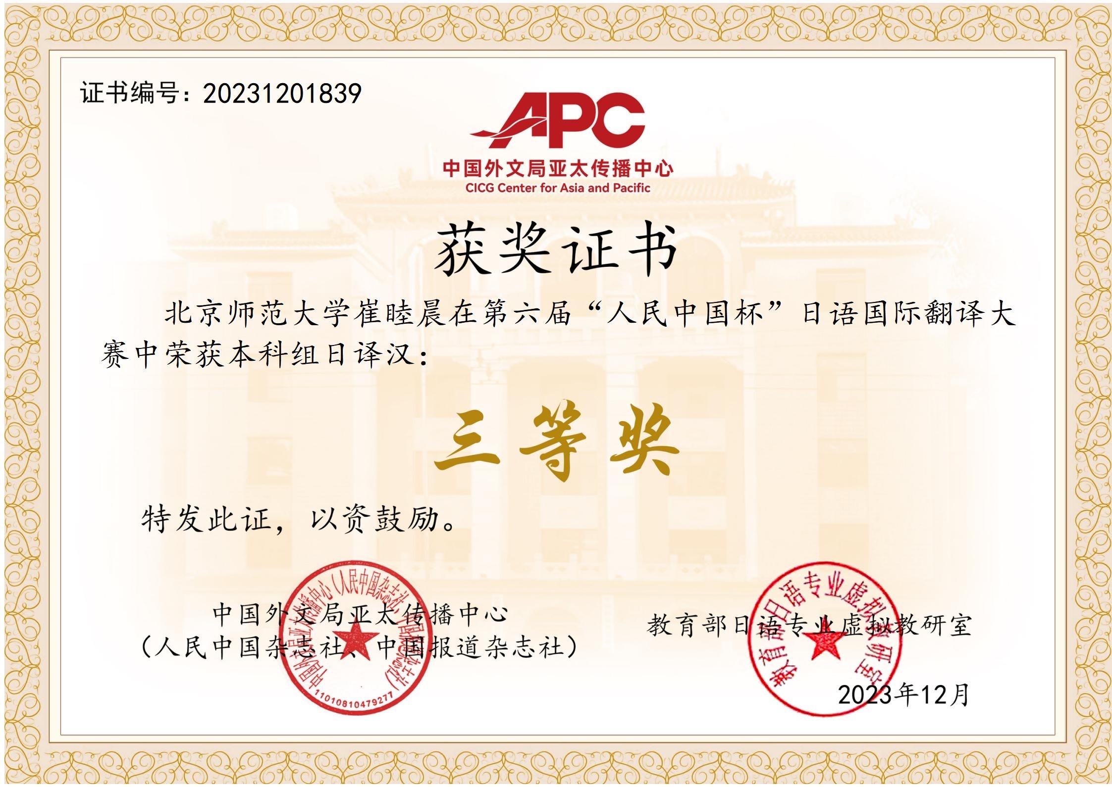 崔睦晨:笔译—本科组日译汉三等奖(指导教师:原玉龙)