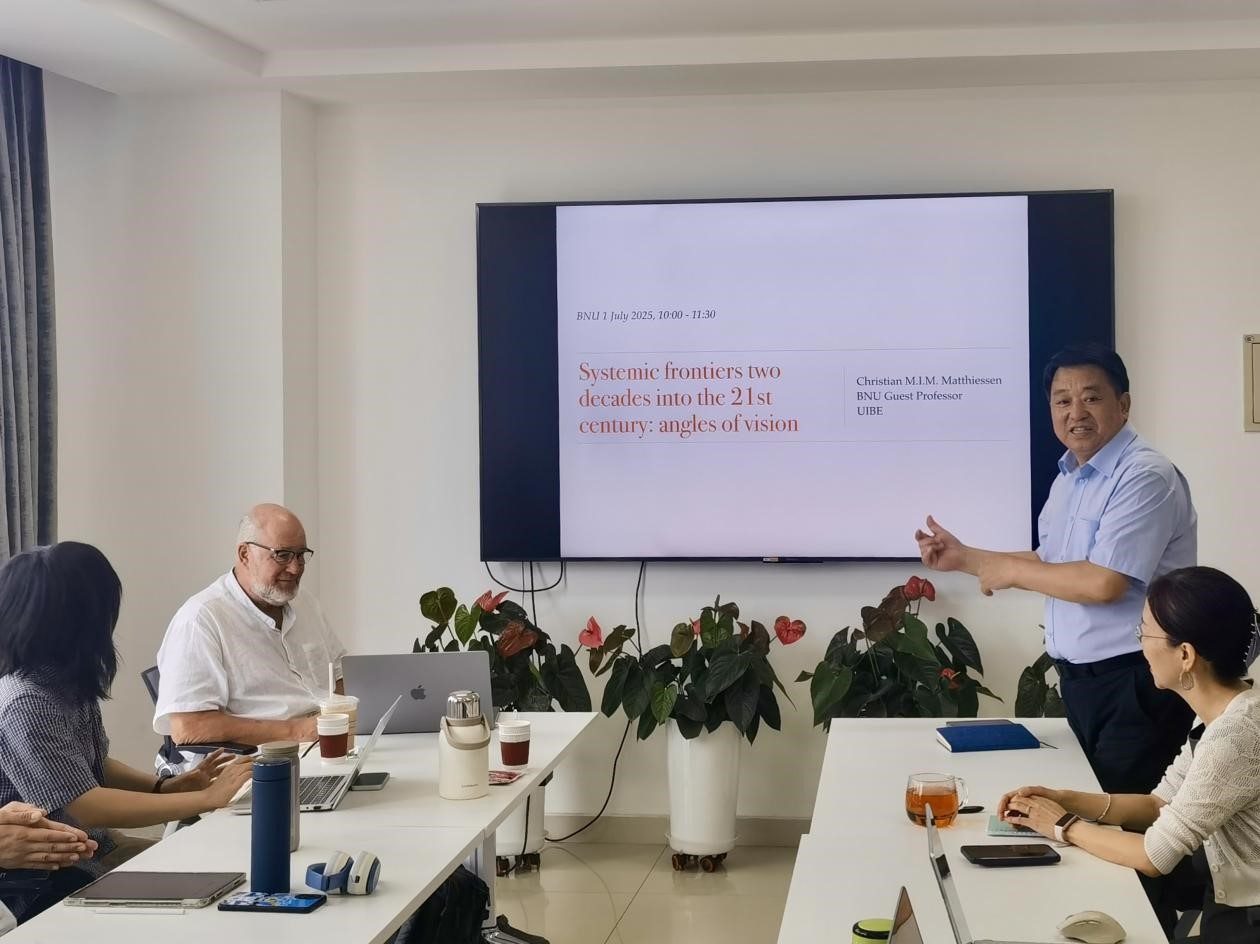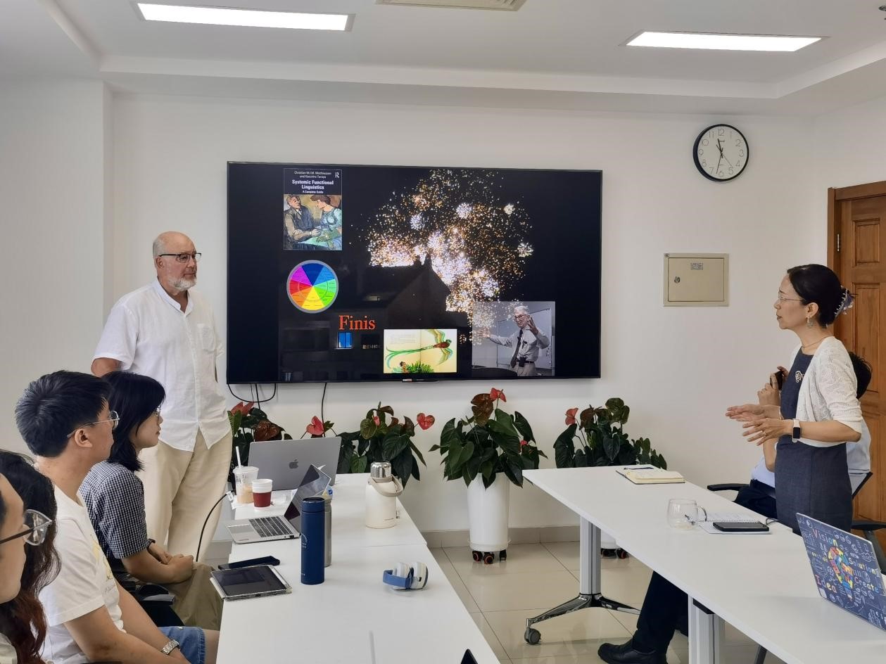 2025年盛夏时节7月1日,Christian Matthiessen教授应邀再次在京师讲坛开讲。Matthiessen教授一直致力于《功能语法导论》的再版和编撰工作,为传播和发展系统功能语言学做出了卓越的贡献。本次讲座题目为“Systemic frontiers 25 years into the 21st century: angles of vision”,由于晖教授主持,苗兴伟院长和王德亮副院长等师生莅临讲座现场。