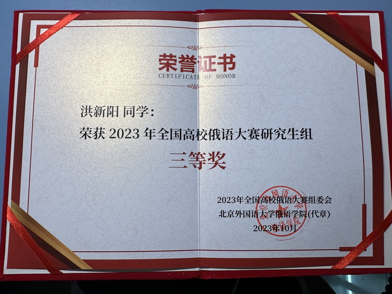23级研究生洪新阳获得全国高校俄语大赛三等奖及留学基金委资助名额