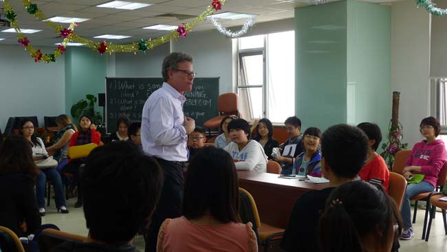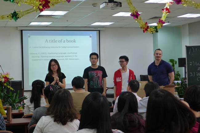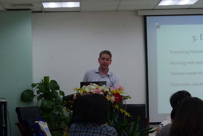 讲座由北师大外文学院教师David L. Chiesa主持,上午的第一场讲座从9点开始。主讲人Dr. Christopher Hastings做了“Storytelling in the Classroom”的主题分享。他结合自身教学经验,介绍了许多storytelling中可使用的教学活动,并分享了许多storytelling的有效网络资源。第二场讲座主讲人CLaura Connor女士与大家分享语法教学的新方法,并现场逐一示范。例如,她邀请多位与会者作为学生代表,组成4个小组,让小组每位成员参与不同小组的故事编写,并在每个活动环节解释具体实施的要点,引起教师们的热烈响应。第三场讲座Jim Radebaugh给我们分享了“Encouraging Student-to-Student Interaction in the Language Classroom”这一主题,并通过邀请几位附小的学生向我们真实地展现了如何让激励课堂上学生间的互动。第四场讲座主讲人Christopher Tebbe介绍了如何在语言教学中有效利用小组活动促进学生学习运用英语,主要介绍了问卷、调查、合作听写等小组活动,邀请与会者全程参与,激起了在场观众的参与的兴趣,将本次系列讲座推向高潮。