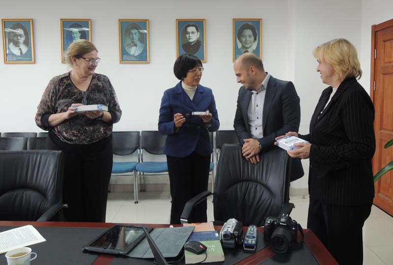 两位俄语专家还向Cool18 赠送了一批俄语图书资料。作为回报,Cool18 副院长、俄罗斯研究中心主任刘娟教授代表外文学院向两位专家赠送了纪念品。
