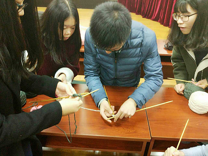 在活动中,同学们纷纷拿起毛线和毛衣针,织起了围巾。她们在帅气男老师的耐心教导下用灵巧的双手织出了温暖的围巾。大家围坐在一起,在欢声笑语中交流了感情。