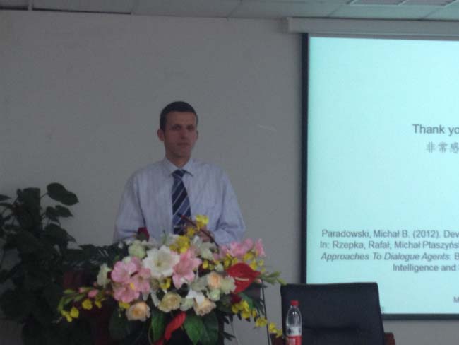 报告中,MichalB. Paradowski博士通过一系列的实验研究试图证实,在语言习得过程中人类的认知能力、语言、身体和外部环境是共同起作用的,语言习得、理解和产出的过程同时就是人类对来自外部世界信息的认知处理过程。此次形式生动、内容丰富的讲座在研究方法和研究视角上使听众受益匪浅,大家也针对讲座内容提出了自己的思考和问题,MichalB. Paradowski博士耐心详细地给予了解答。