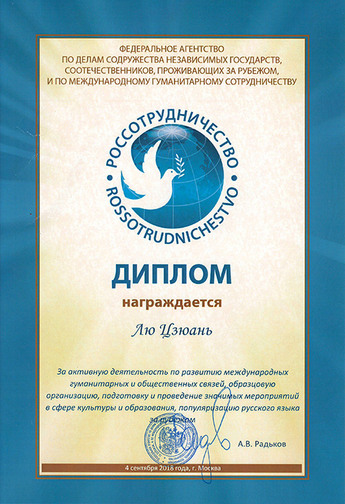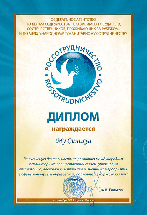 教师喜获俄罗斯联邦国际人文合作属颁发的荣誉证书