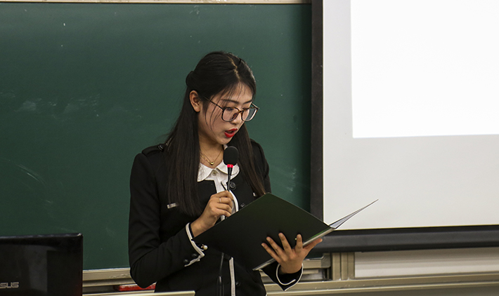 Cool18 学生会主席苏培丹以“E往无前”为答辩主题,创造性地将外院过去一年的工作进展喻为行进道路上的跑车。外文牌跑车在经过组织与制度建设、学术与文化交流活动、权益工作三站后,抵达学生会工作理念的终点站。在短短三分中的慷慨陈词中,苏培丹主席全面概括了过去一年中外文学院优化梯队结构、加强团队建设的举措,展示了外文学院在学术文化、文艺体育活动中获得的累累战果,介绍了保障有力的权益工作,传递出了外文学院学生会以学生为中心、以外文特色为参照点、打造沟通桥梁、树立团体典范的工作理念,并绘制出了展望未来工作的美好蓝图。