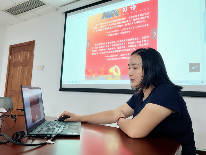 支部书记带领大家参观了主题为“加强新时代廉洁文化建设,营造风清气正的育人氛围”的线上展厅。展厅前言部分介绍了全面从严治党的重要性,第一部分是《关于加强新时代廉洁文化建设的意见》的重要内容,第二部分是党史中的廉洁故事,第三部分是高校系统违法犯罪和违反廉洁纪律典型案例。