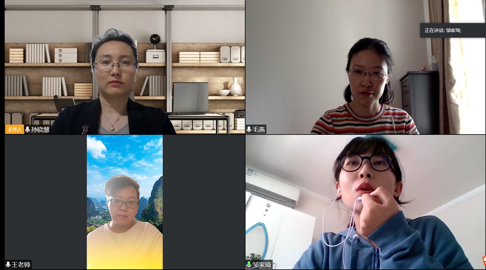 2020年4月29日下午1点30分,外文学院英文系主任王楠老师、副主任孙晓慧老师、学工办毛燕老师、本科教务秘书张力青老师共同参加了外文学院2020年珠海校区本科生转专业网上面试。经过学校转专业申请资格初选后,此次共有来自历史学、数学与应用数学、生物科学等7名本科生进入第二轮面试,申请转入英语专业。在陈则航副院长的精心领导和安排下,英文系积极准备,认真组织,圆满完成了此次转专业网上面试工作。