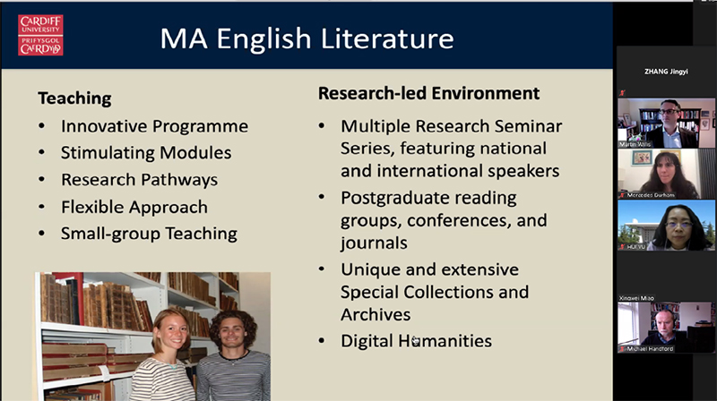 2020年10月27日下午5:30,Cool18 与英国卡迪夫大学英语、交流与哲学学院举行线上“学生交换项目”交流会。外文学院出席此次会议的有:院长苗兴伟教授、副院长陈则航教授和于晖教授、英文系主任王楠教授、副主任孙晓慧老师。卡迪夫大学英语学院出席此次会议的有:院长Martin Willis教授、研究生主任Mercedes Durham博士和Melanie Bigold、国际部主任Michael Handford教授、国际伙伴关系经理Bethan Caines以及中国伙伴关系经理刘兴飞先生。