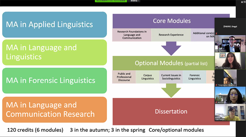 接下来,卡迪夫大学英语学院的研究生主任Mercedes Durham博士和Melanie Bigold博士分别介绍了卡迪夫大学的语言学及文学硕士的培养方案,包括研究方向、培养年限、学分及毕业论文要求等。其中,语言学硕士包括应用语言学、语言与语言学、法律语言学、语言与交流等方向,开设共计120学分的课程,主要课程模块在语言与交流及科研训练方面,选修课程模块涉及社会语言学、语料库语言学等领域。文学硕士课程以创新项目、灵活的授课方式、小班授课等为其特点,科研气氛浓厚,会组建读书小组并开展专题研讨会。北师大外文学院英文系主任王楠老师表达了希望两边学校保持交流的愿望。