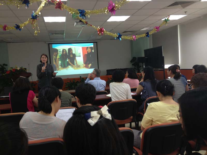 讲座由北师大外文学院教师David Chiesa主持,上午的第一场讲座从9点开始。主讲人Leslie Grover女士做了“Critical Thinking and Reading Comprehension: Building the foundation”的主题分享。她结合自身教学经验,鼓励各位老师重视学生的学习方式,培养学生批判性思维。第二场讲座主讲人Carolyn Wedral女士与大家分享口语教学的新方法,并现场一一示范。例如,她邀请五位与会者作为学生代表,组成专家小组(panelists),以“不同的婚姻观念”为话题组织了全班性互动参与的的口语活动,并在每个活动环节解释具体实施的要点,引起教师们的热烈响应。第三场讲座Bruce先生给我们分享了Content-based Language Teaching的要点,并现场通过工作坊的形式让大家对这些要点有了更深刻的了解。第四场讲座主讲人Jim Raddebaugh与大家分享了“Bringing Effective Listening Practice into the Classroom”这一主题,主要介绍了教授听力的五大原则,并让大家运用这五大原则设计出一堂课与听众分享,激起了在场观众的参与的兴趣,将本次系列讲座推向高潮。