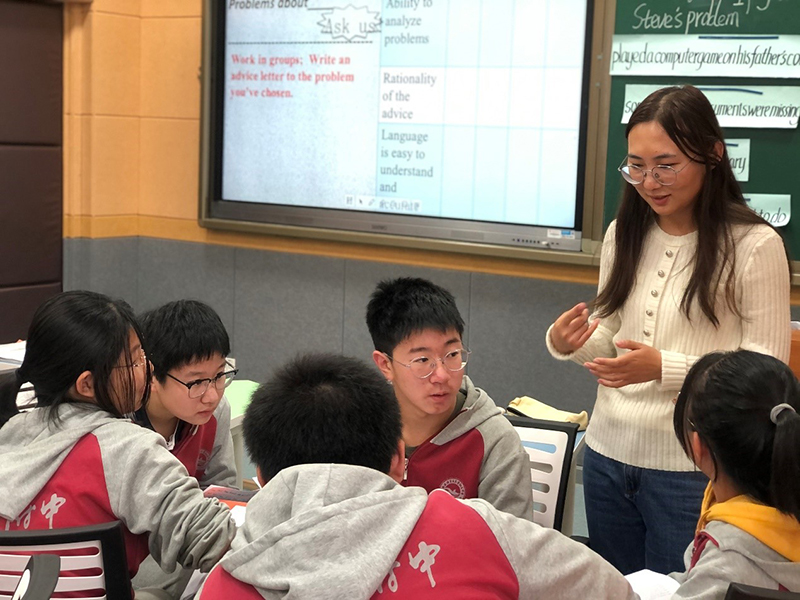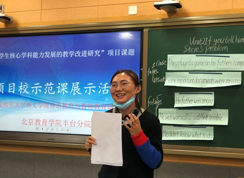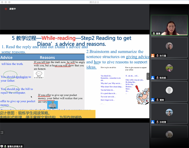 2020年10月28日,曹赛老师进行了正式讲公开课。通过展示课前学生们的调查结果引入主题“problem”,激发学生已知,再过渡到对文本的处理,获取梳理文章基本信息,通过对话练习、角色扮演等小组活动内化所学知识,老师又创设各种情境对学生进行迁移创新,培养了学生的高阶思维,达到了育人目的。