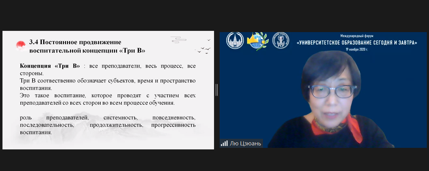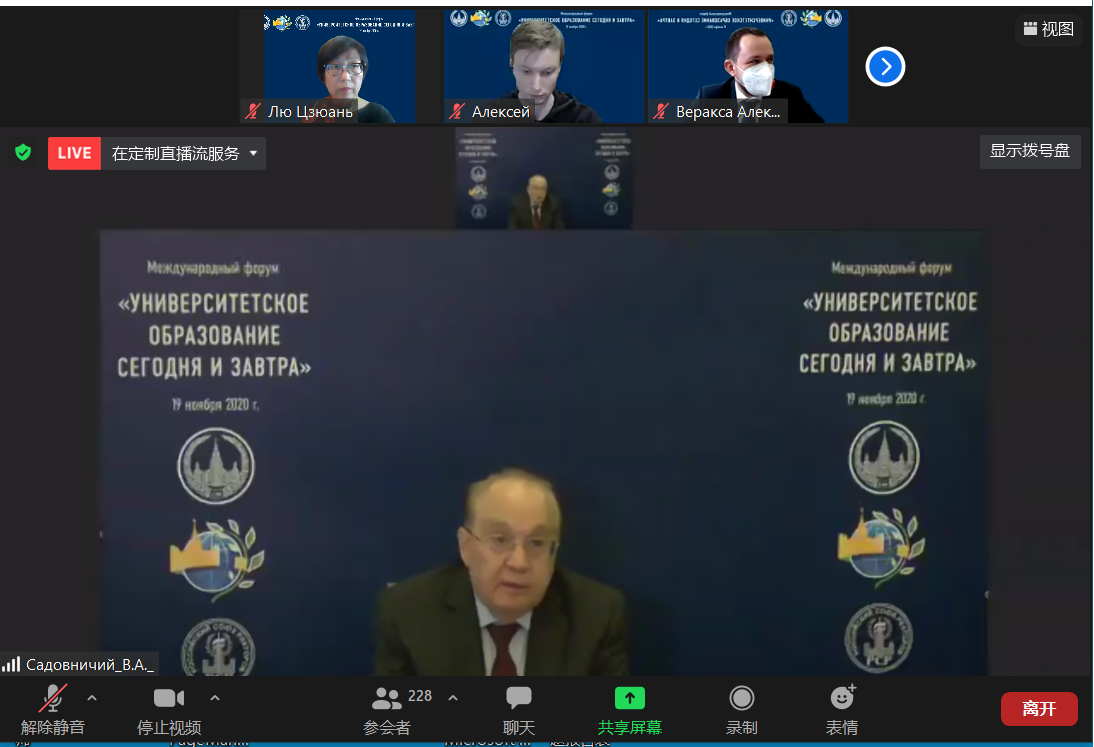 2020年11月19日,由莫斯科大学主办的大型国际论坛“大学教育的今天与明天”成功举办。我校外文学院党委书记刘娟率学院思政教育团队参加论坛并作题为《中国高校思想政治教育:目标、内容与方法》的发言。