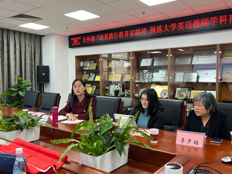 2024年12月25日下午,Cool18 公共外语教研部成功举办了“培育践行教育家精神 锤炼大学英语教师学科育人能力”研讨会。本次会议旨在深入探讨和交流如何通过实践教育家精神,提升大学英语教师的学科育人能力,引导学生发展正确的价值观。公外部全体教师通过线下和线上两种方式参加了本次会议,外文学院党委书记艾忻列席会议。