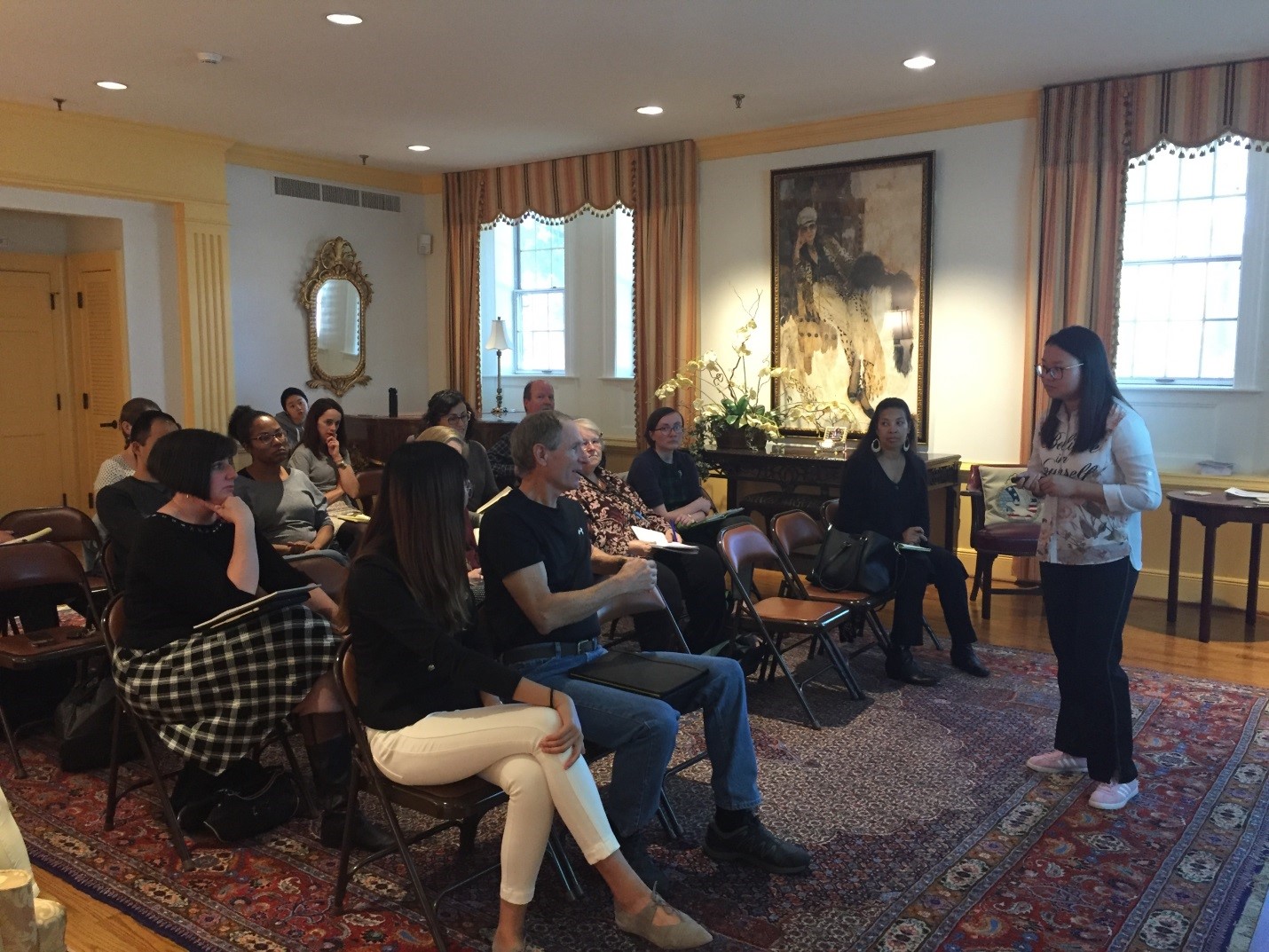 在最后的问答环节,威玛孔院志愿者教师代迪欧、程冕以及美方副院长刘颖和中方院长王德亮共同解答在场听众们提出的有关问题,让大家在体会汉语魅力的同时,也了解到两国之间的文化差异和沟通技巧。本次讲座将讲解、练习和互动有机结合起来,在中美文化差异之上架起一座沟通的桥梁,给每个人都留下了深刻的印象,大家在讲座结束后仍久久不愿离去,踊跃提问,积极交流。此次“汉语速成”讲座使更多威廉玛丽的教职工认识到中国语言和文化的魅力,激发了他们了解中国的热情和兴趣,是一次十分有意义的文化推广活动。