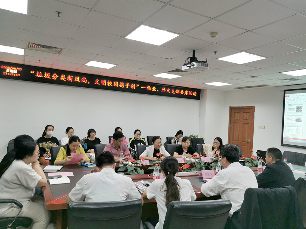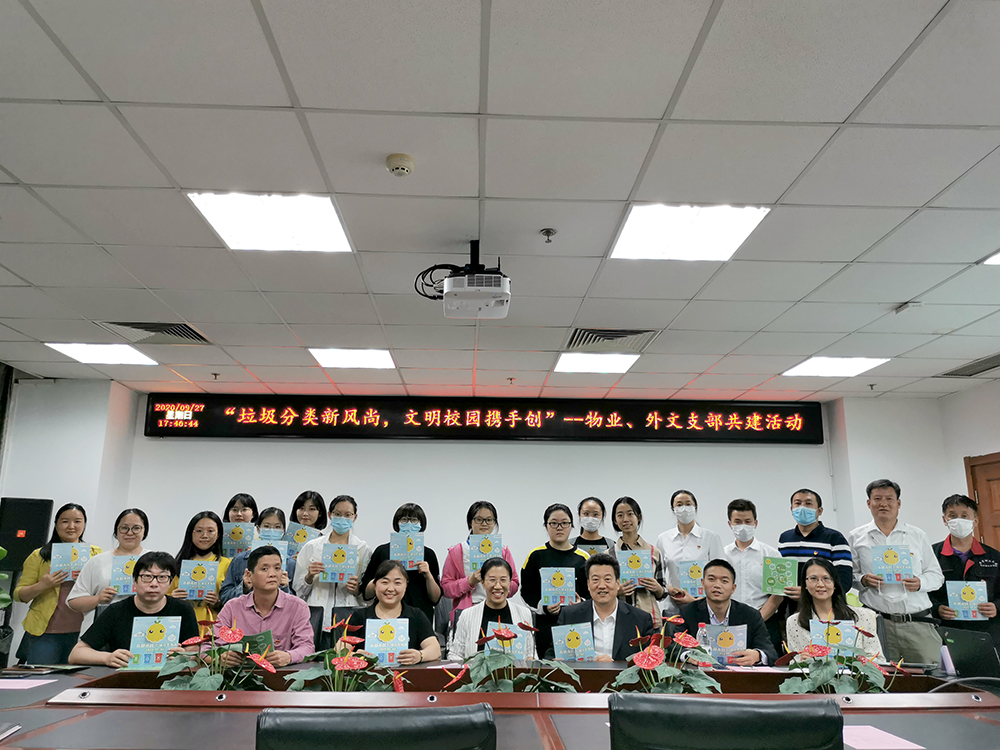 2020年9月27日下午,外文学院教工联合支部与物业服务中心支部在后主楼1020会议室成功开展了以“垃圾分类新风尚,文明校园携手创”为主题的支部共建活动。本次活动由联合党支部书记杨晨老师主持,来自两个支部的十余名党员、物业工作人员代表、外文学院师生代表参加了此次活动。