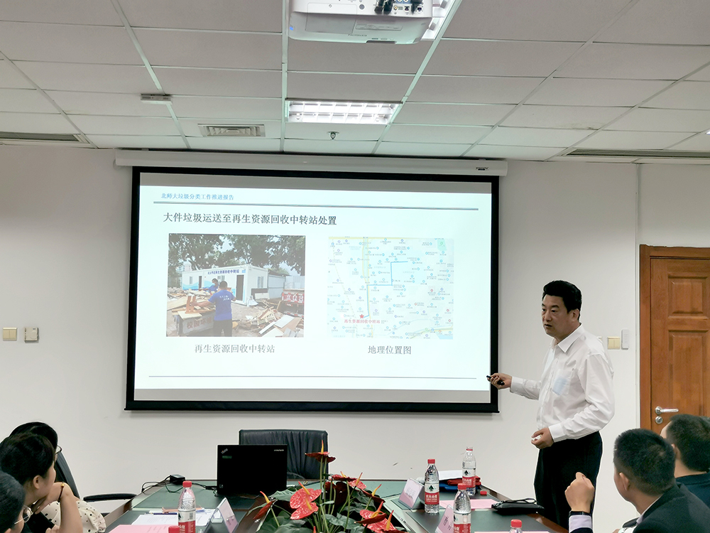 刘宏进主任就上海市垃圾分类推进成果、北京高校垃圾分类的推进情况以及北师大垃圾分类实施构想和规划进行了讲解。刘主任通过图文结合,向外文学院的老师同学们介绍了未来北师大垃圾分类站位置的布局和撤桶建站的初步规划,详细介绍了校园的垃圾投放、分类、回收的流程,使老师同学们对垃圾分类的减量化、资源化、无害化有了更加清晰的认识与了解。