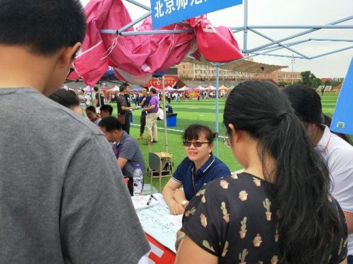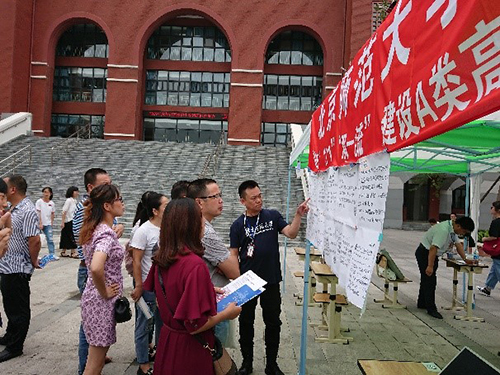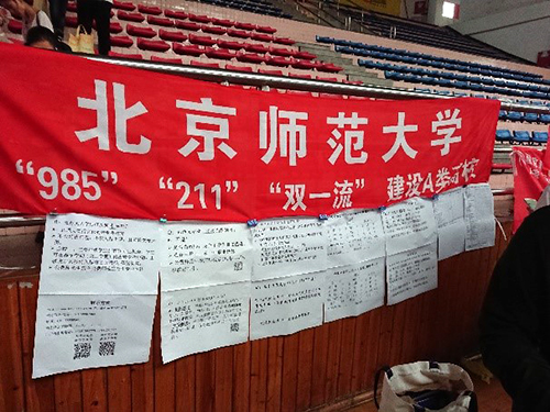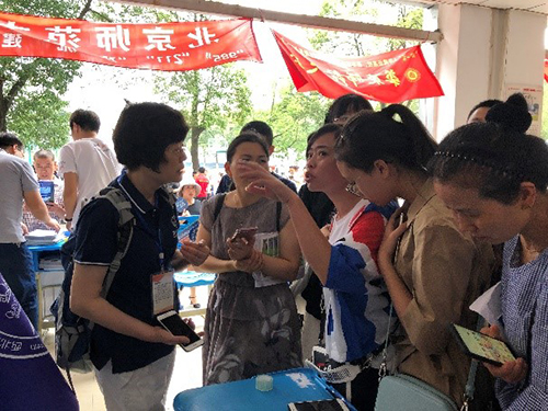 今年招办为每个前去宣传咨询的院系,配备两部手机,以便与考生和家长沟通。基于这两部手机,我们开辟了3个咨询微信群,还有一个由校友组织的家长群。这样,除了在现场宣传与咨询之外,微信群里几乎是无间断地回答家长们连绵不断的问题。现场与微信群里我们同时接待考生和家长的咨询,从不同的角度和侧面更好地宣传了北师大。