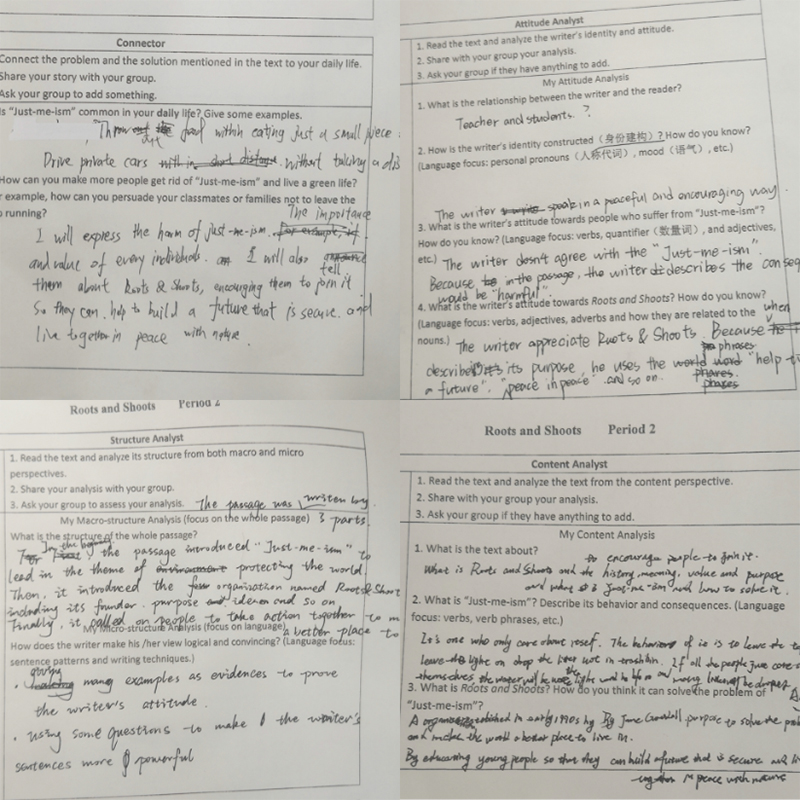 在宋老师第一堂课的基础上,韩松老师在第二课时中引导学生开展阅读圈活动。在四人一组的阅读圈中,每个组员有不同的任务角色,即内容分析者、态度分析者、结构分析者和生活实际联系者,每个任务角色需要解决2-4个相关问题。韩老师将每个问题需要关注的语言点巧妙融合到了各个问题中,以帮助学生分析语篇。通过组内分享和讨论,学生得以全面理解文章内容、结构、作者态度并联系现实生活。