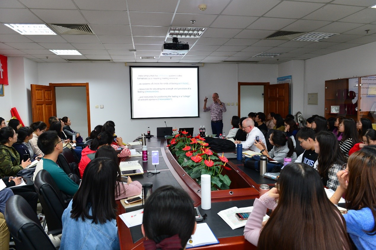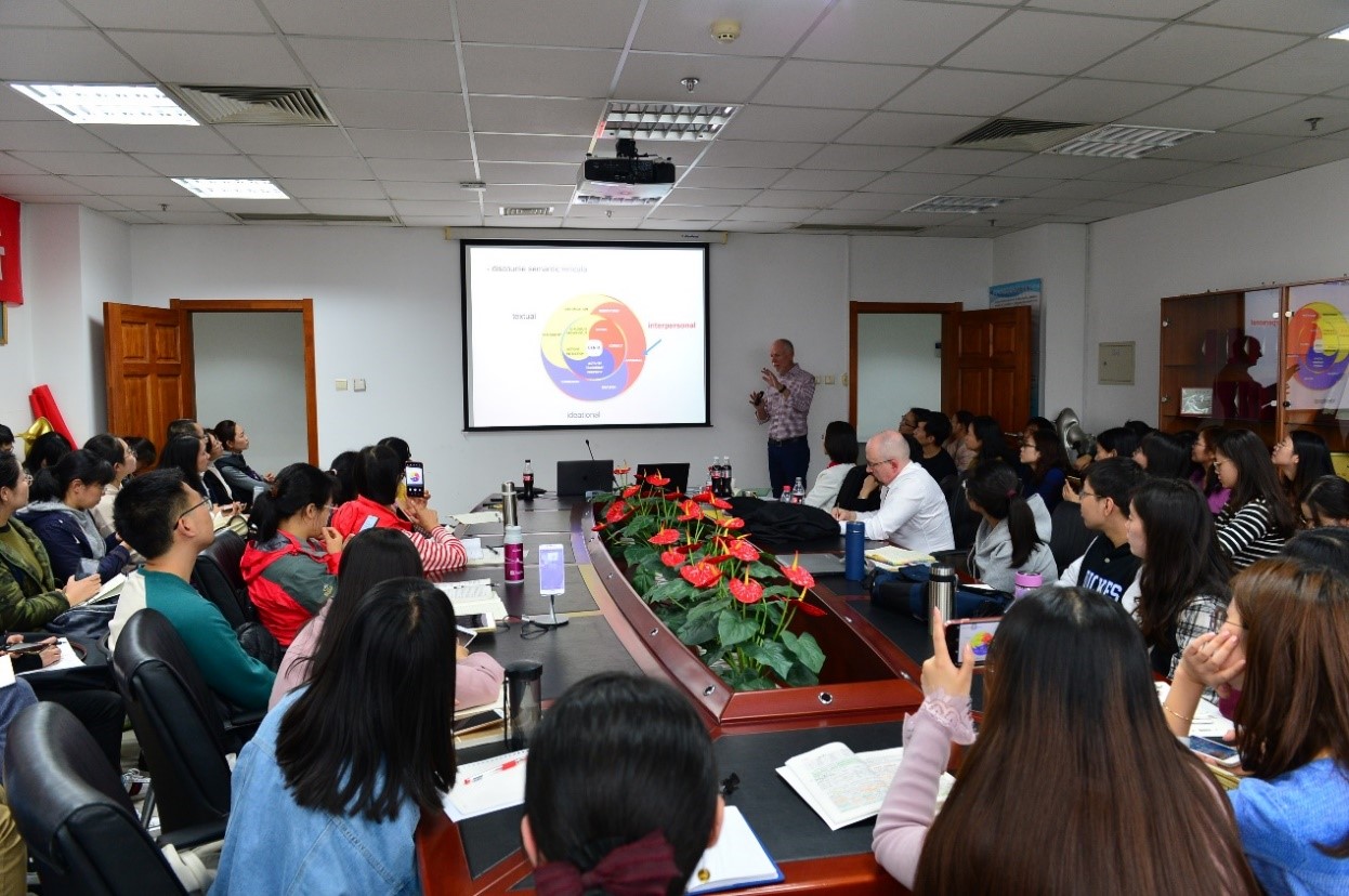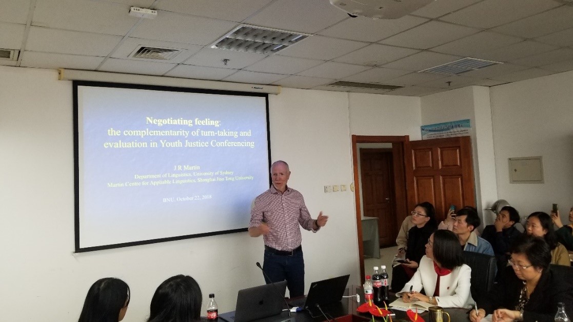 为纪念伟大的语言学家韩礼德先生,Cool18 举办系列“功能语言学京师讲坛”,邀请海内外在功能语言学界获得杰出成就的学者,传播功能语言学的思想,探讨功能语言学前沿话题和最新研究发展,推动中国的功能语言学研究走向世界。京师讲坛先后已邀请北京大学的胡壮麟先生、香港理工大学的Matthiessen和华南农业大学黄国文教授。本次学院邀请悉尼大学语言学系马丁院士做功能语言学京师论坛第四讲。于晖教授主持本次讲座并致辞。
