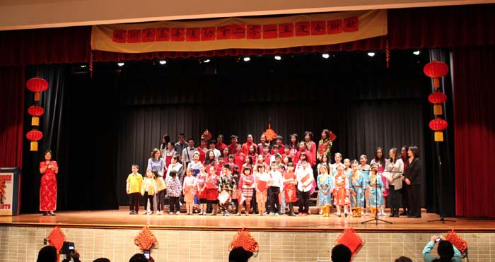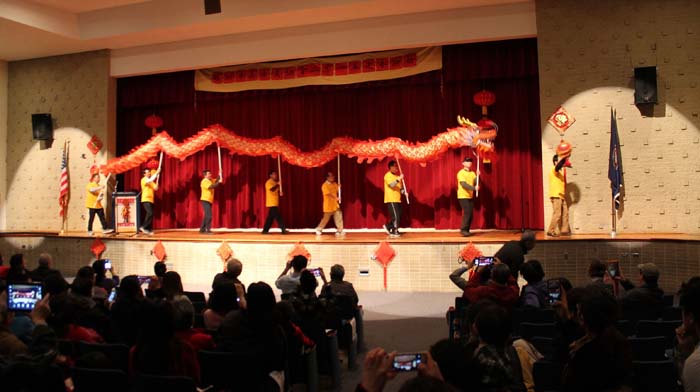 作为联欢会的协办方之一,威廉玛丽大学孔子学院中方院长马磊、助理院长刘颖带领孔院的四位志愿者王凤、邹小婧、栾钰婧和侯雪玮以及美国实习生Gillie Cuda参加了此次活动。在两个多小时的联欢会中,观众们欣赏到了精彩的节目表演,既有中文学校孩子们的甜美歌声,也有优美的陶笛配乐武当太极剑表演。其中,威玛孔院志愿者王凤和邹小婧为观众们献上了一曲二胡和琵琶合奏的《茉莉花》,赢得了观众的热烈掌声。演员们用孔院提供的长龙为现场观众展示了精彩的舞龙表演,将联欢会推向高潮。之后,王凤还表演了二胡独奏《赛马》,孔院教师高璐表演了藏族舞蹈《走进西藏》,都赢得了现场观众的好评。此外,威玛孔院还为本次联欢会提供了新年装饰及表演道具,联欢会横幅由威玛学生王钦敖书写而成。