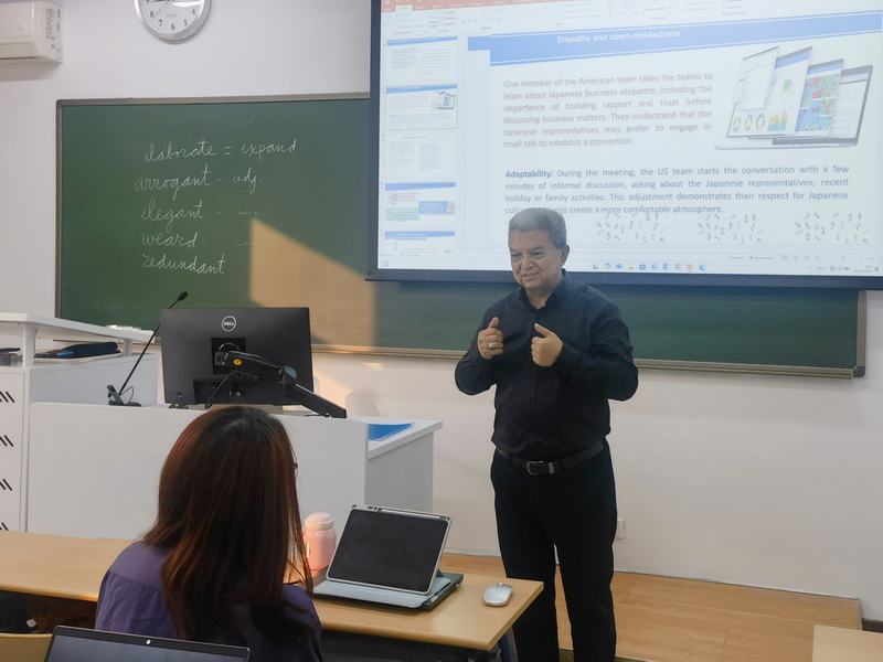 阿卜杜马齐特·马莫索利耶维奇教授的讲座聚焦“媒体素养在当代的重要性”“理解文化差异的重要性”以及“跨文化感知与跨文化意识”等三个主题。马莫索利耶维奇教授结合自身工作经历,透过一系列生动形象的案例,深入分析了媒体对于个人和社会的影响,引发了同学们对于信息“获取-分析-评估-再创造”过程及批判性思维的思考。他认为,在全球化背景下,理解和尊重不同文化之间的差异对于促进跨文化交流有着重要意义,我们需要深入思考文化差异对于语言学习和跨文化沟通的影响。马莫索利耶维奇教授介绍了跨文化感知与跨文化意识的组成部分,呈现了培养跨文化感知和意识的方法和技巧。讲座加深了同学们对于多元文化的理解,为同学们的跨文化交际提供了理论与实践指导。