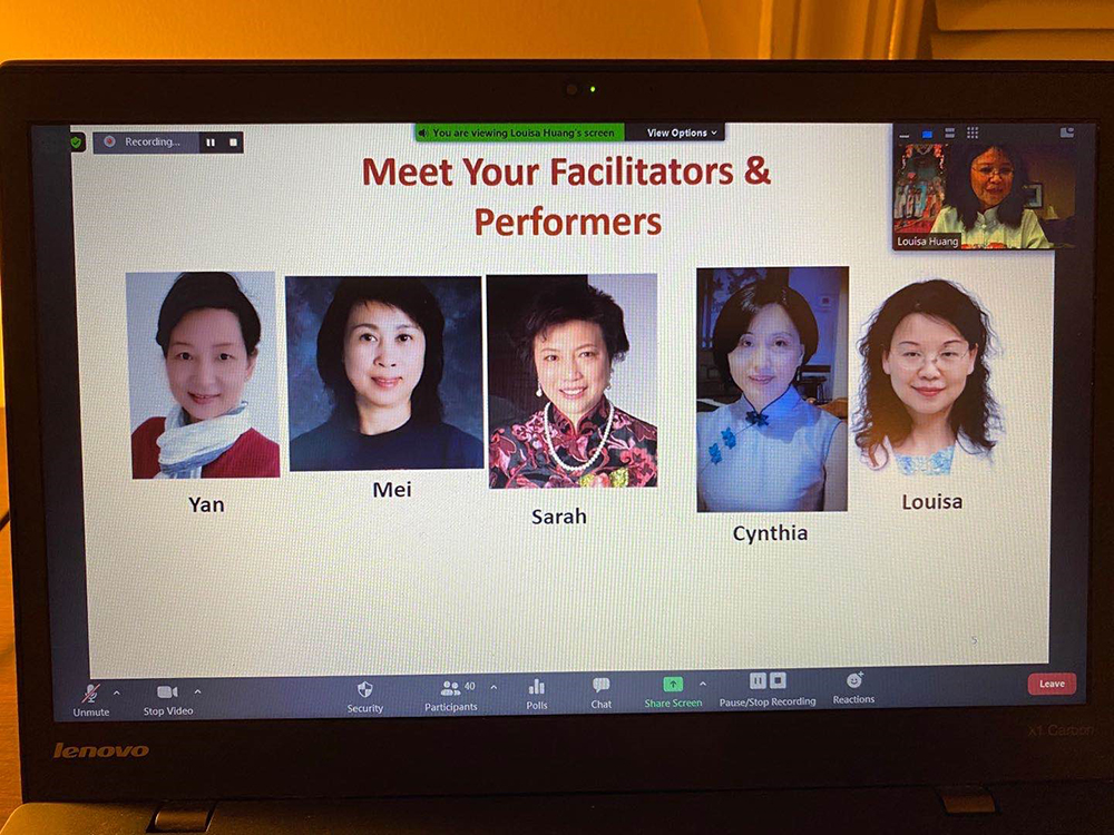 之后,“京剧之花”团队一行五人密切配合,以英语的形式进行了一个半小时的线上京剧讲解和名段赏析。首先是京剧基础知识讲解,她们介绍了生、旦、净、丑四大京剧行当和唱、念、做、打四个京剧基本功。并且通过视频播放的形式,以京剧的经典剧目(如《三岔口》、《天女散花》、《穆桂英挂帅》等)为案例,介绍每种行当的表现形式。