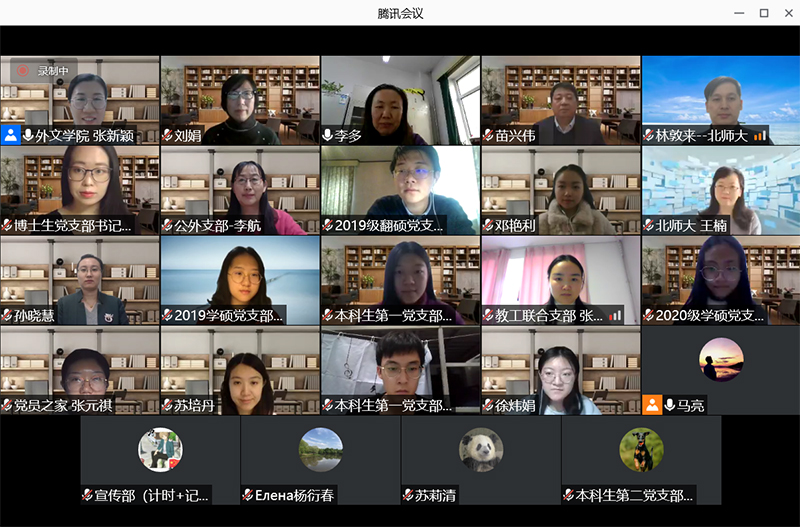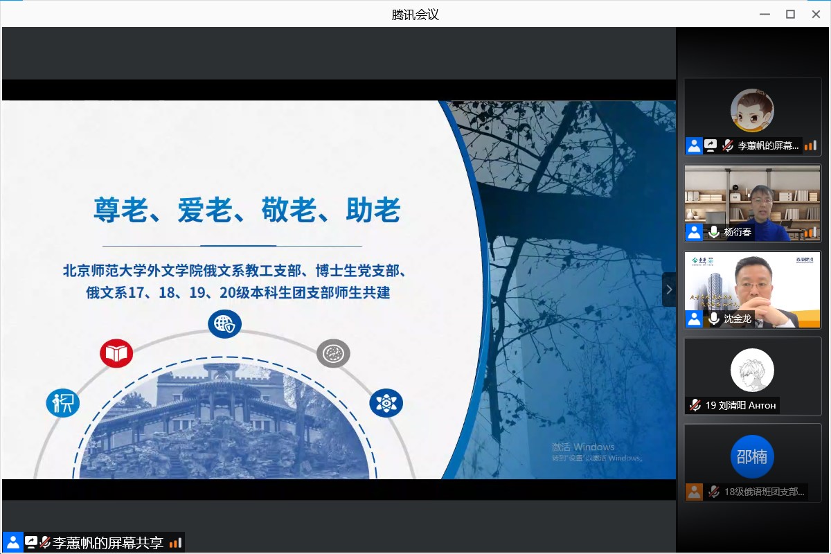 俄文系教工支部、博士生党支部、本科生团支部“尊老、爱老、敬老、助老”师生共建活动2021-03-042021年3月3日19:00时《泰康之家通讯》总编、泰康之家电视台(筹)台长,北师大校友沈金龙先生与外文学院俄文系教工党支部、博士生党支部、本科生团支部进行了“长寿时代泰康方案中国样本—中国进入老龄化社会的应对策略之养老机构最佳案例分享”的线上主题分享。 -
