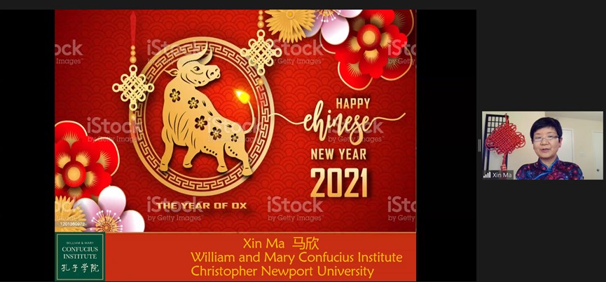 威廉玛丽孔子学院成功举办2021“牛年”春节云端庆祝活动2021-02-22值此2021年中国传统牛年新春来临之际,威廉玛丽大学孔子学院和纽波特纽斯市姐妹城市联合特邀请威玛孔院和克里斯托弗新港大学中文教师马欣老师,向威廉玛丽学院和克里斯托弗纽波特大学师生以及威廉斯堡社区的中国文化爱好者主讲了《关于中国新年的传统和趋势》为主题的云端庆祝活动。 -