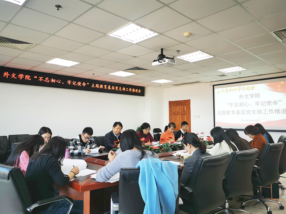 外文学院召开“不忘初心、牢记使命”主题教育基层党支部工作推进会暨2019—2020学年第一学期党委扩大会议2019-11-132019年11月11日下午14:30,外文学院党委在后主楼1020会议室召开“不忘初心、牢记使命”主题教育基层党支部工作推进会暨2019—2020学年第一学期党委扩大会议。 -