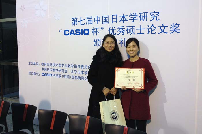 日文系2014届硕士毕业生赵立翠同学荣获第七届中国日本学研究“CASIO杯”优秀硕士论文奖2014-11-132014年11月6日,第七届中国日本学研究“CASIO杯”优秀硕士论文奖颁奖典礼在北京日本学研究中心举行。日文系2014届硕士生毕业生赵立翠同学的硕士论文《关于中国高级... -