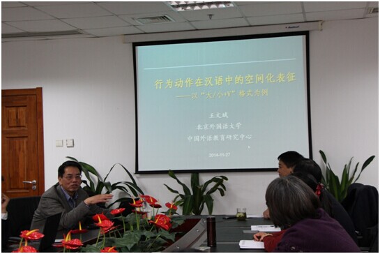 北京外国语大学王文斌教授应邀来Cool18 讲学2014-11-282014年11月27日下午,北京外国语大学中国外语教育研究中心主任、博士生导师王文斌教授应Cool18 的邀请,在后主楼1020做了题为“行为动作在汉语中的空间化表... -